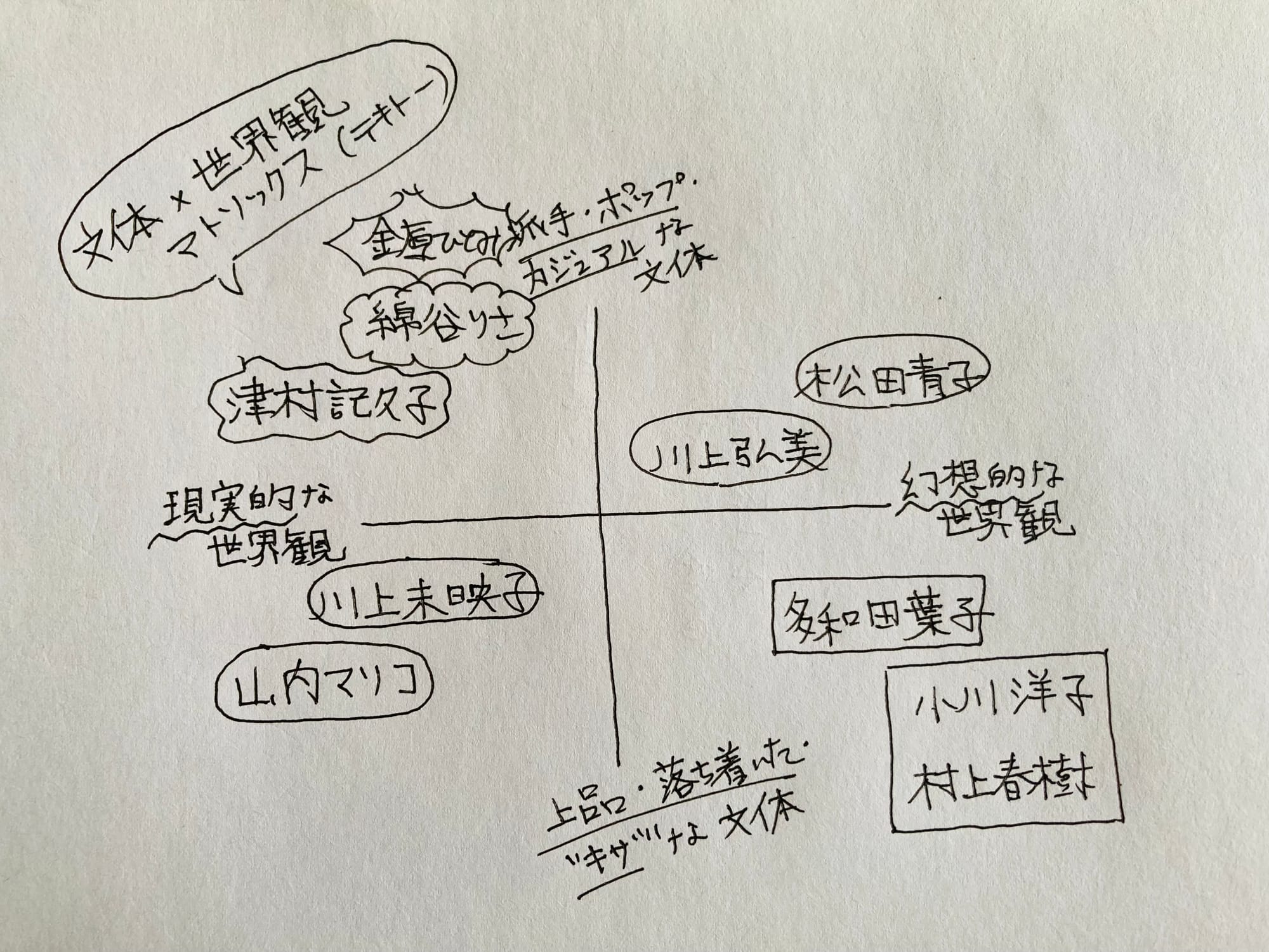 最後に、好きな作家でこの二つの要素をマトリックスにしてみた。